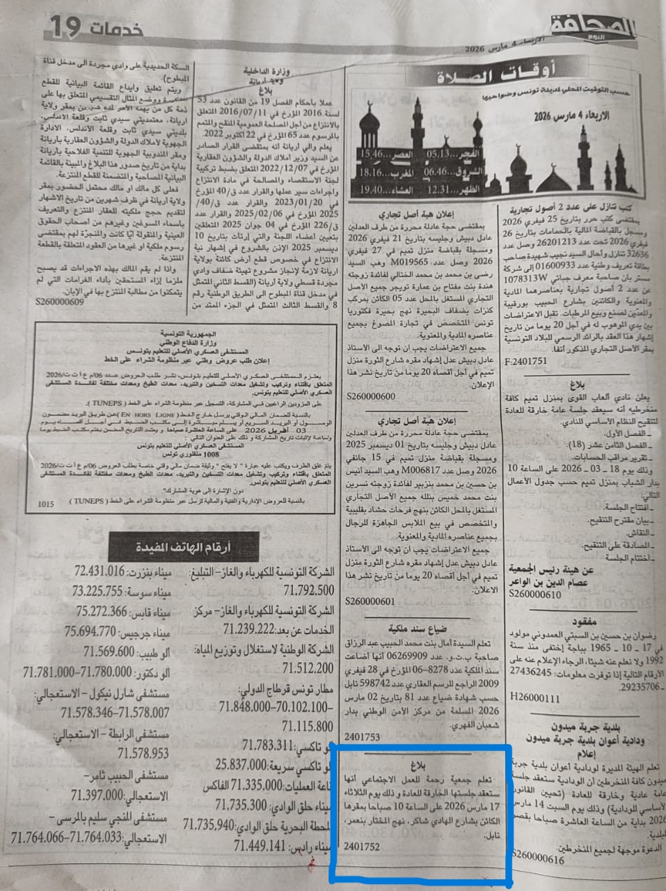 بلاغ تغيير مقر الجمعيةبواسطة Bacem Ksouri / 2 مارس 2026 تعلم جمعية رحمة للعمل الاجتماعي انها ستعقد جلسة خارقة للعادة و ذلك يوم الثلاثاء 17 مارس 2026 على الساعة 10 صباحا بمقرها الكائن بشارع الهادي شاكر نهج المختار بنعمر نابل